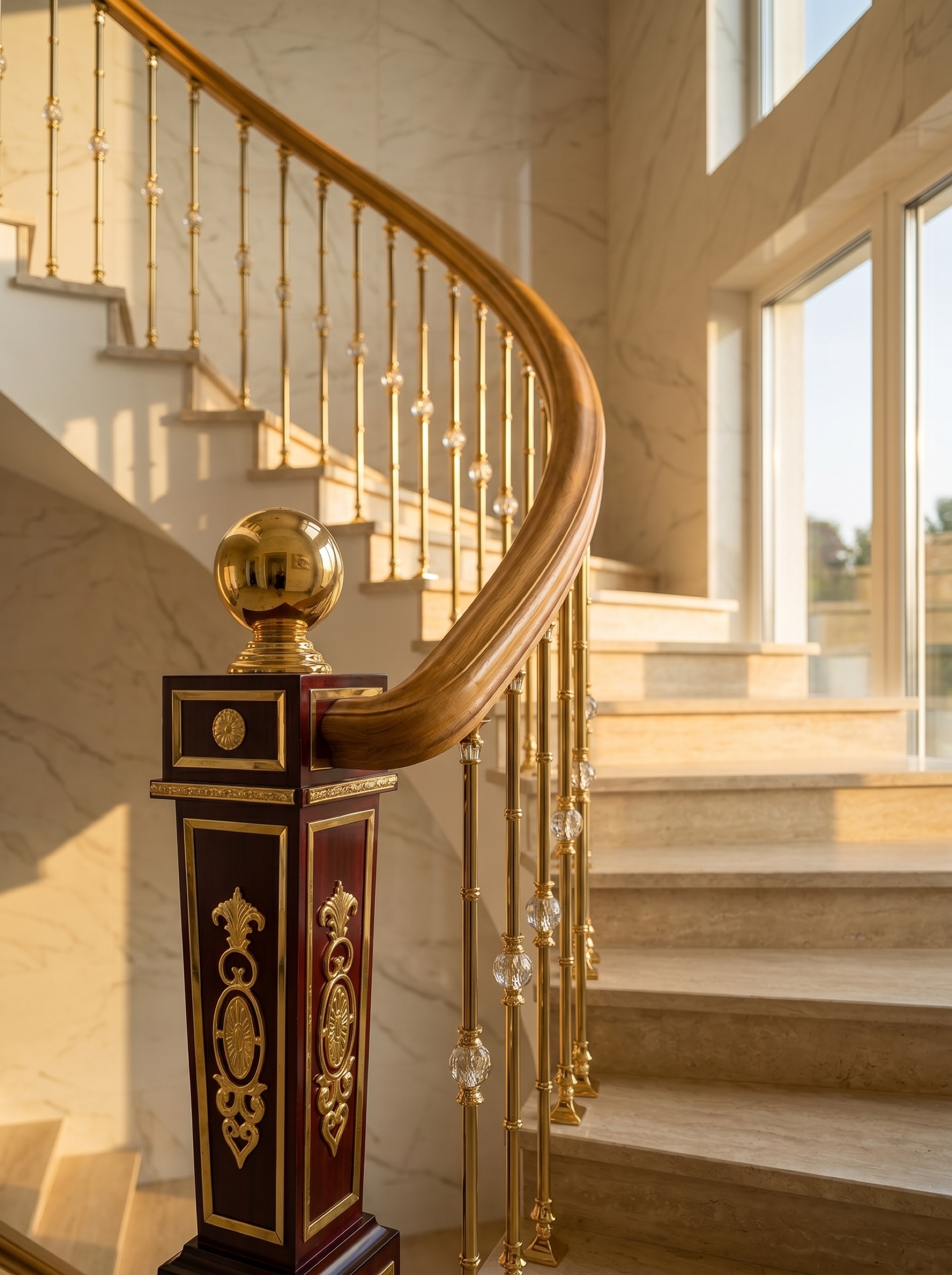 128 Designer-Modelle in Aluminium, Messing, Marmor und Kristall. Direkt vom Hersteller in Foshan, designed in Deutschland — ohne Markenaufschlag. Komplettlösung mit Einbau oder B2B-Großhandel für Treppenbauer.